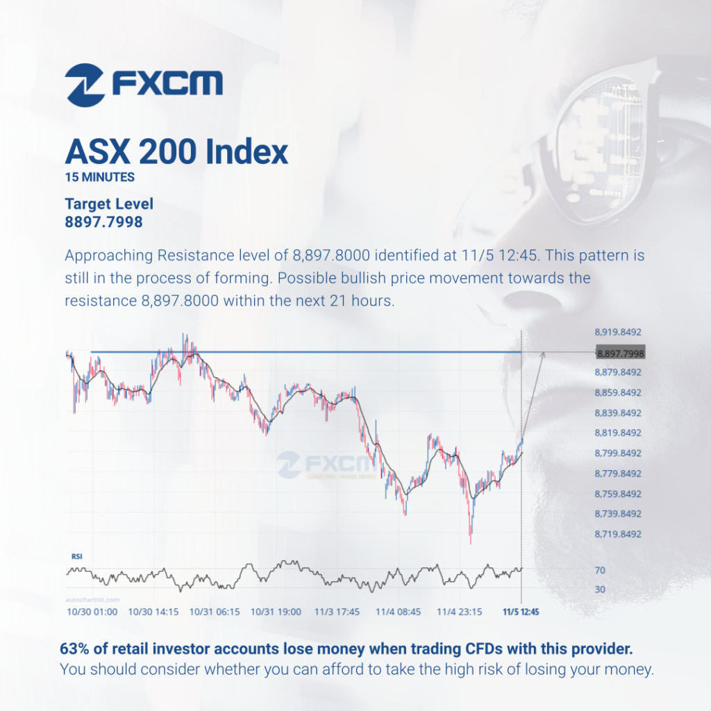 Approaching Resistance level of 8,897.8000 identified at 11/5 12:45. This pattern is still in the process of forming. Possible bullish price movement towards the resistance 8,897.8000 within the next 21 hours. Past performance is not an indicator of future results. Losses can exceed deposits.