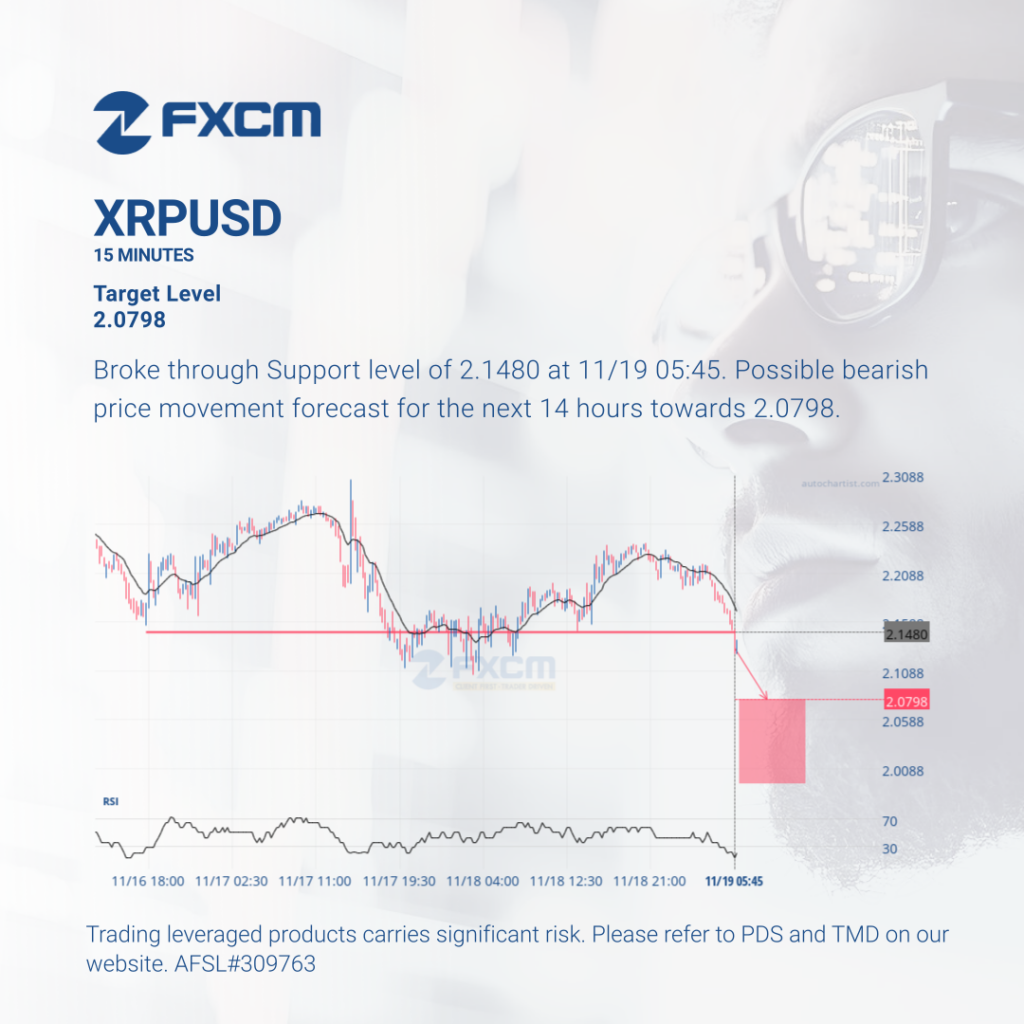 Broke through Support level of 2.1480 at 11/19 05:45. Possible bearish price movement forecast for the next 14 hours towards 2.0798. Past performance is not an indicator of future results. Trading leveraged products carries significant risk. Please refer to PDS and TMD on our website. AFSL#309763