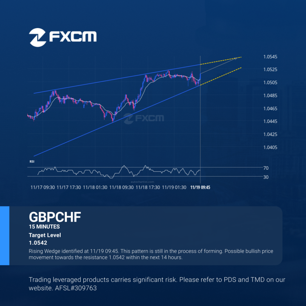 Rising Wedge identified at 11/19 09:45. This pattern is still in the process of forming. Possible bullish price movement towards the resistance 1.0542 within the next 14 hours. Past performance is not an indicator of future results. Trading leveraged products carries significant risk. Please refer to PDS and TMD on our website. AFSL#309763