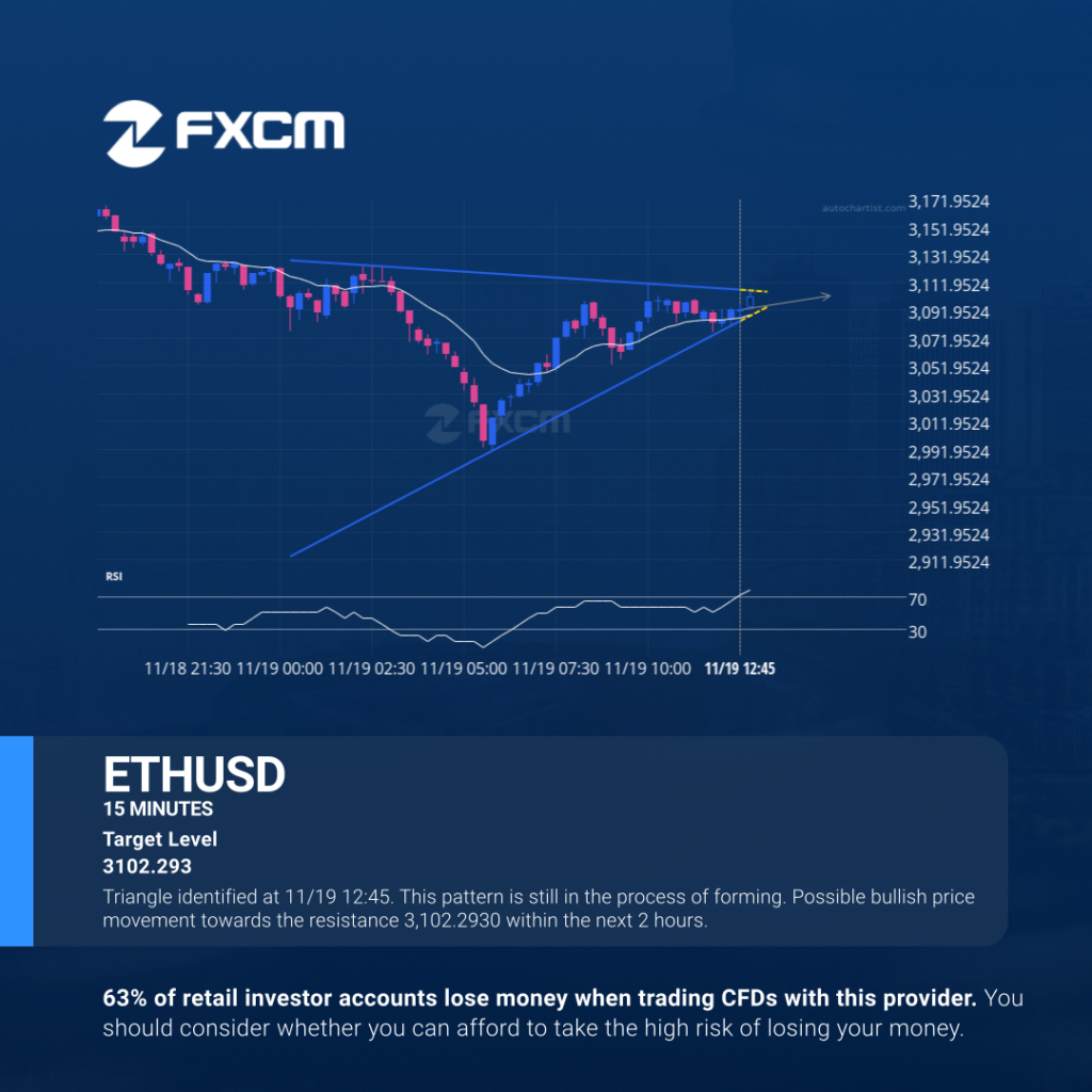 Triangle identified at 11/19 12:45. This pattern is still in the process of forming. Possible bullish price movement towards the resistance 3,102.2930 within the next 2 hours. Past performance is not an indicator of future results. Losses can exceed deposits.