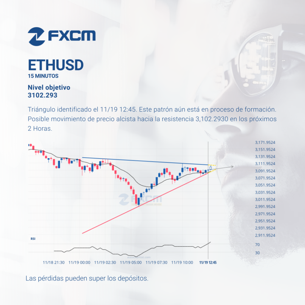 Triángulo identificado el 11/19 12:45. Este patrón aún está en proceso de formación. Posible movimiento de precio alcista hacia la resistencia 3,102.2930 en los próximos 2 Horas. El rendimiento pasado no es indicativo de resultados futuros. Las pérdidas pueden exceder los fondos depositados.