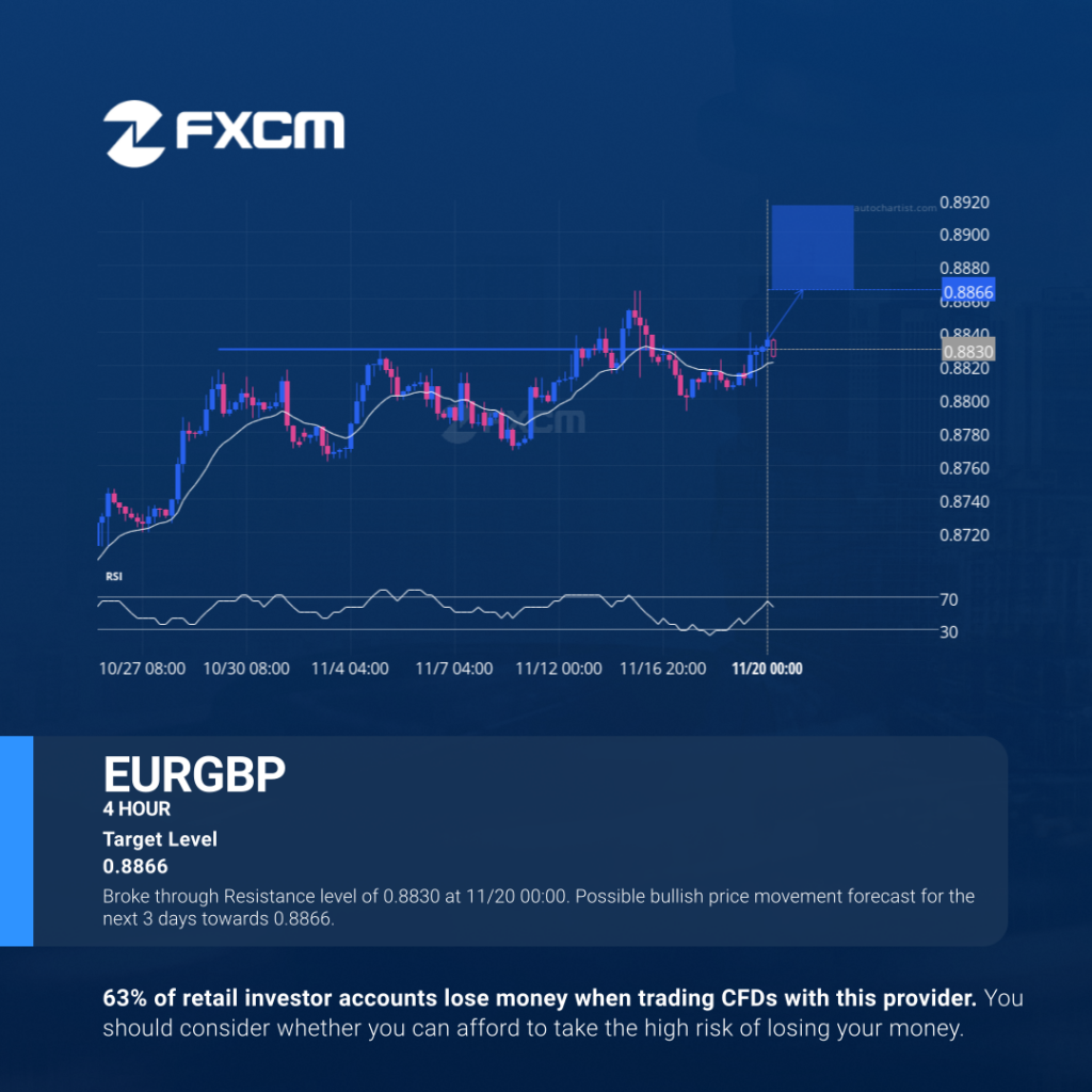 Broke through Resistance level of 0.8830 at 11/20 00:00. Possible bullish price movement forecast for the next 3 days towards 0.8866. Past performance is not an indicator of future results. Losses can exceed deposits.