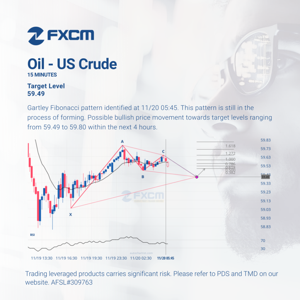 Gartley Fibonacci pattern identified at 11/20 05:45. This pattern is still in the process of forming. Possible bullish price movement towards target levels ranging from 59.49 to 59.80 within the next 4 hours. Past performance is not an indicator of future results. Trading leveraged products carries significant risk. Please refer to PDS and TMD on […]
