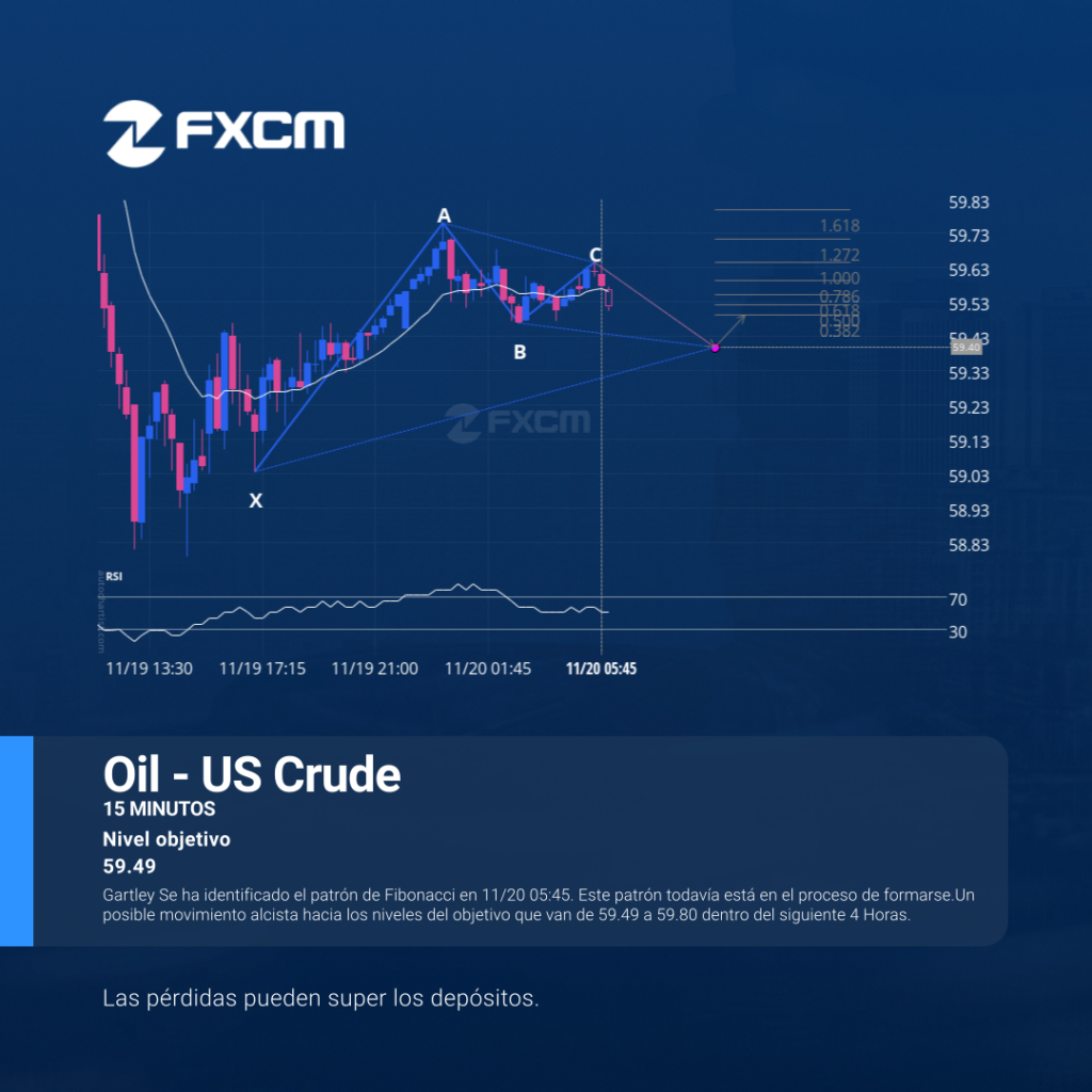 Gartley Se ha identificado el patrón de Fibonacci en 11/20 05:45. Este patrón todavía está en el proceso de formarse.Un posible movimiento alcista hacia los niveles del objetivo que van de 59.49 a 59.80 dentro del siguiente 4 Horas. El rendimiento pasado no es indicativo de resultados futuros. Las pérdidas pueden exceder los fondos depositados.