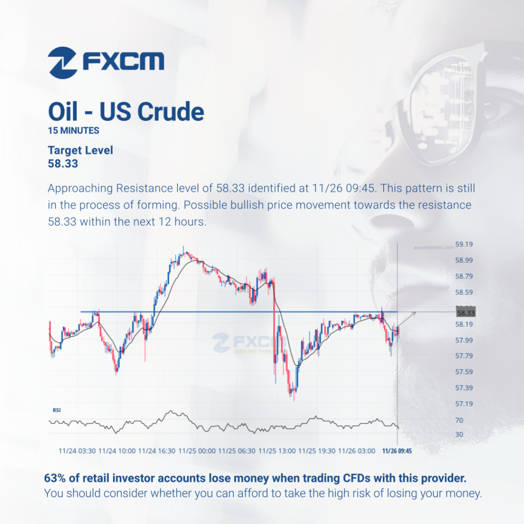 Approaching Resistance level of 58.33 identified at 11/26 09:45. This pattern is still in the process of forming. Possible bullish price movement towards the resistance 58.33 within the next 12 hours. Past performance is not an indicator of future results. Losses can exceed deposits.