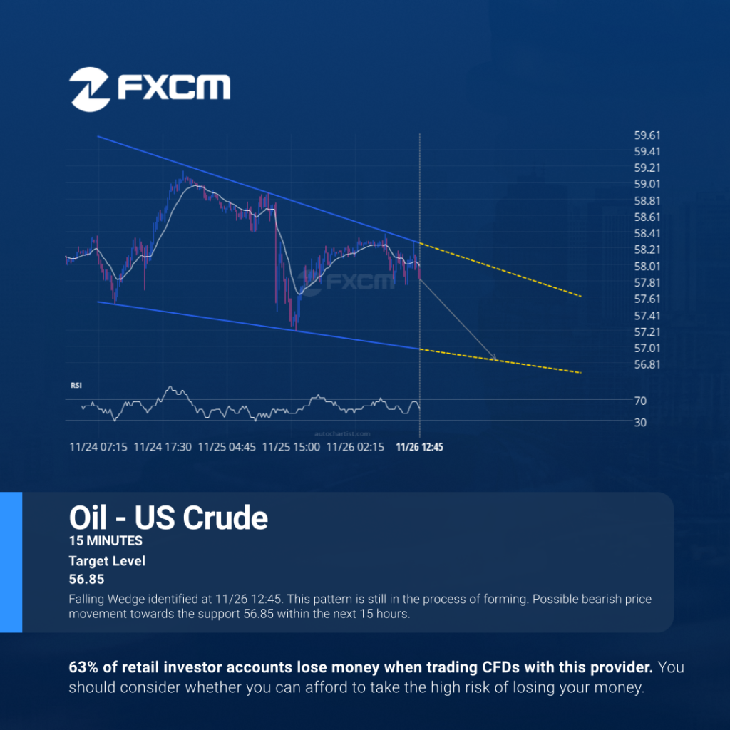 Falling Wedge identified at 11/26 12:45. This pattern is still in the process of forming. Possible bearish price movement towards the support 56.85 within the next 15 hours. Past performance is not an indicator of future results. Losses can exceed deposits.