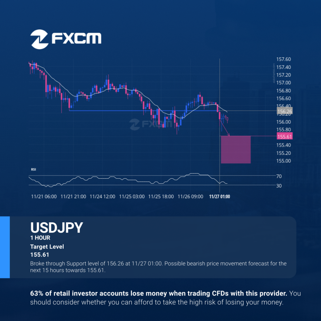 Broke through Support level of 156.26 at 11/27 01:00. Possible bearish price movement forecast for the next 15 hours towards 155.61. Past performance is not an indicator of future results. Losses can exceed deposits.