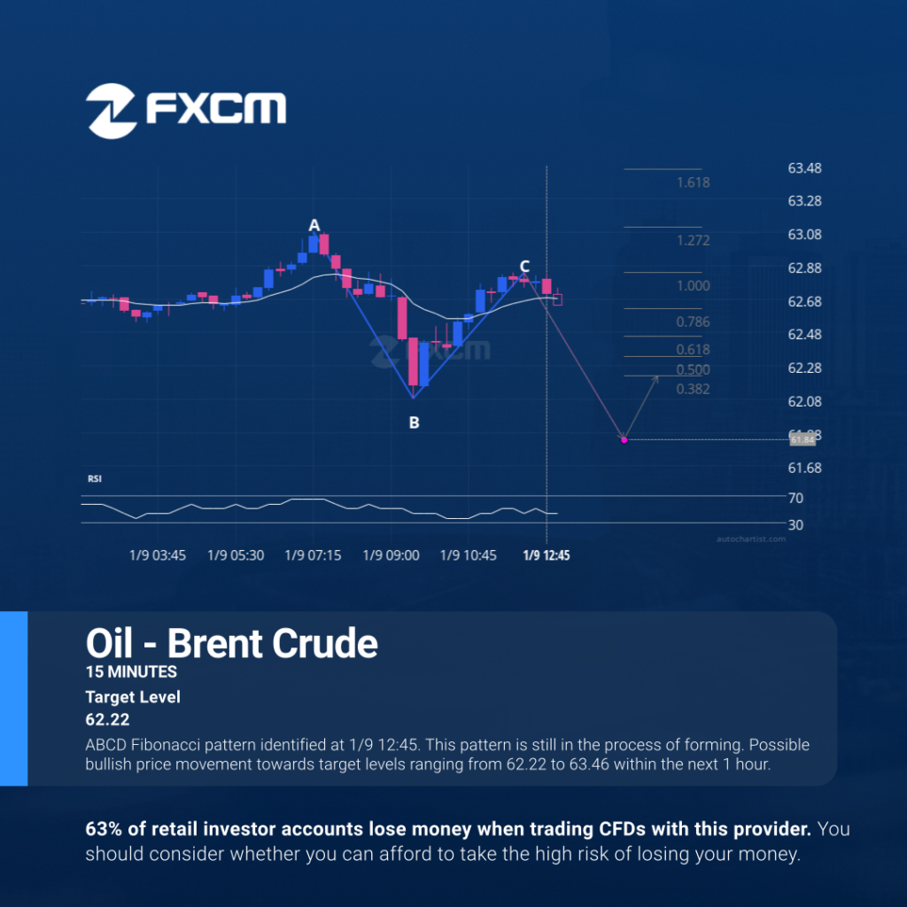 ABCD Fibonacci pattern identified at 1/9 12:45. This pattern is still in the process of forming. Possible bullish price movement towards target levels ranging from 62.22 to 63.46 within the next 1 hour. Past performance is not an indicator of future results. Losses can exceed deposits.