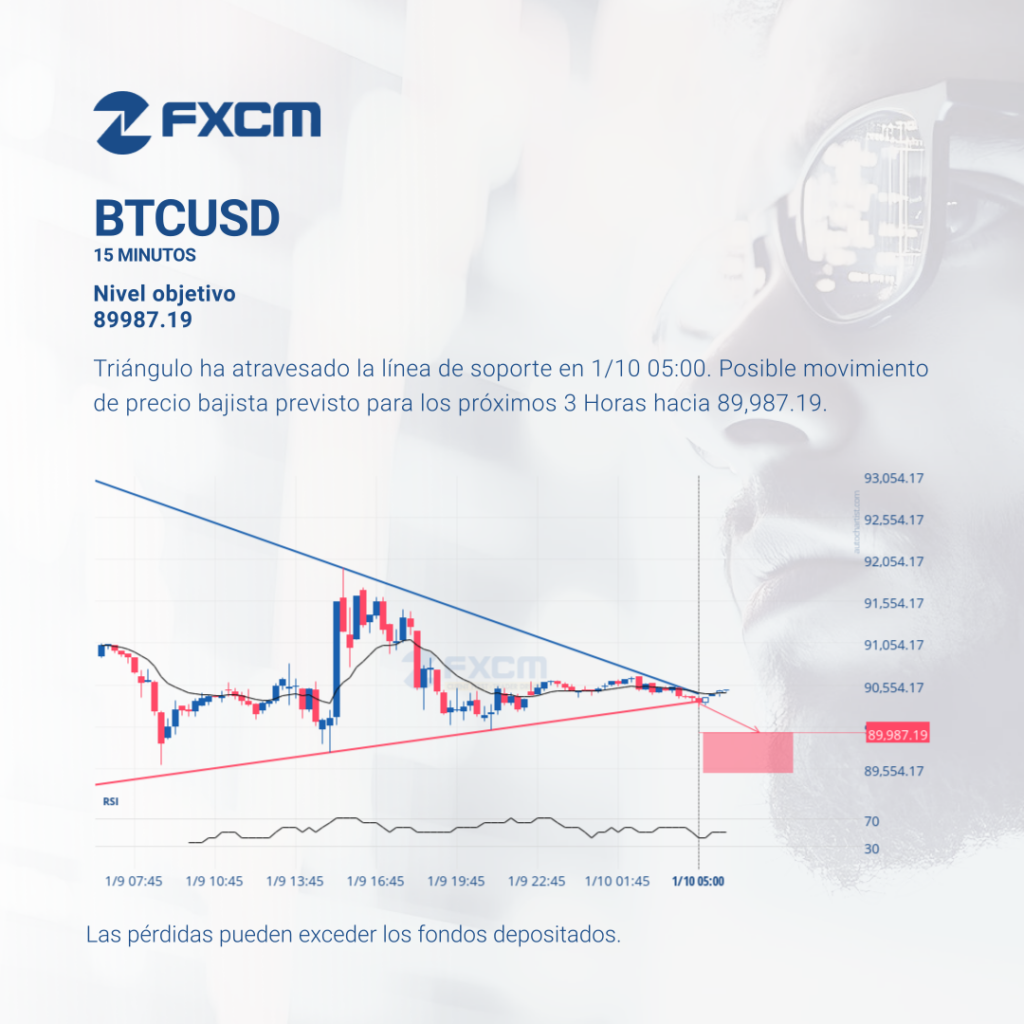Triángulo ha atravesado la línea de soporte en 1/10 05:00. Posible movimiento de precio bajista previsto para los próximos 3 Horas hacia 89,987.19. El rendimiento pasado no es indicativo de resultados futuros. Las pérdidas pueden exceder los depósitos.
