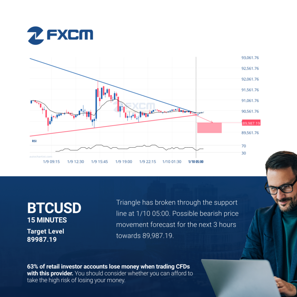 Triangle has broken through the support line at 1/10 05:00. Possible bearish price movement forecast for the next 3 hours towards 89,987.19. Past performance is not an indicator of future results. Losses can exceed deposits.