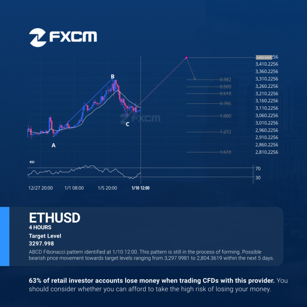 ABCD Fibonacci pattern identified at 1/10 12:00. This pattern is still in the process of forming. Possible bearish price movement towards target levels ranging from 3,297.9981 to 2,804.3619 within the next 5 days. Past performance is not an indicator of future results. Losses can exceed deposits.