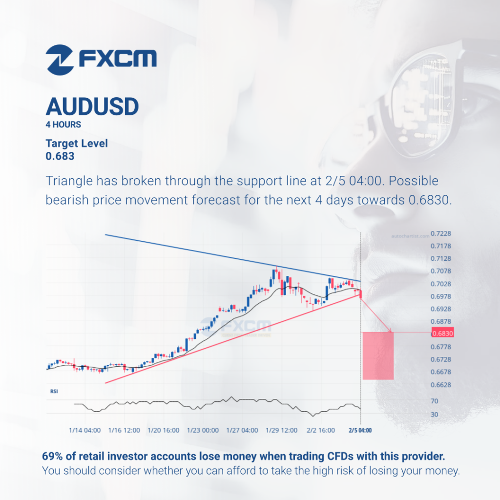 Triangle has broken through the support line at 2/5 04:00. Possible bearish price movement forecast for the next 4 days towards 0.6830. Past performance is not an indicator of future results. Losses can exceed deposits.