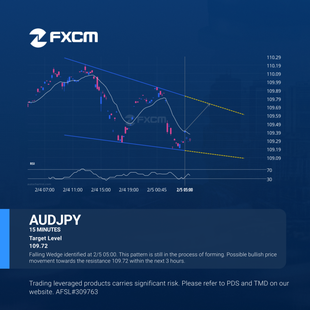 Falling Wedge identified at 2/5 05:00. This pattern is still in the process of forming. Possible bullish price movement towards the resistance 109.72 within the next 3 hours. Past performance is not an indicator of future results. Trading leveraged products carries significant risk. Please refer to PDS and TMD on our website. AFSL#309763