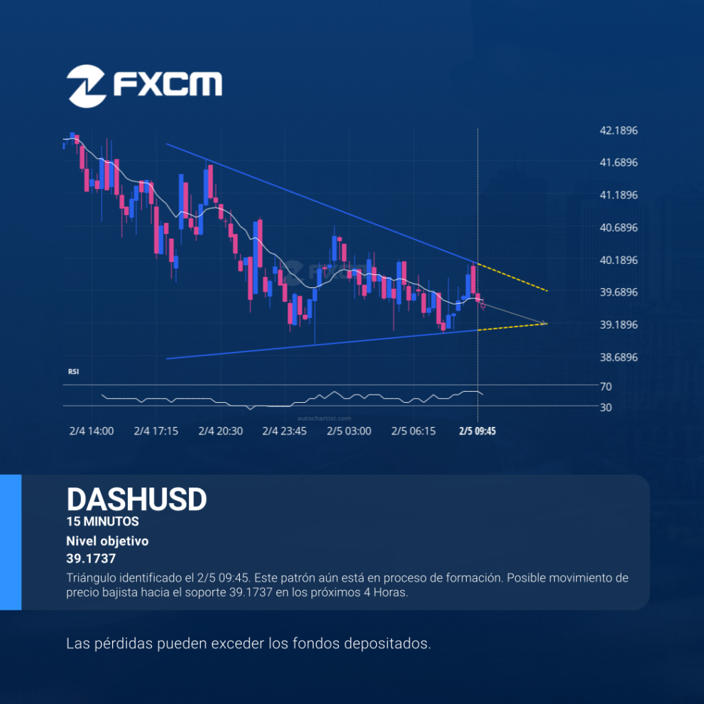 Triángulo identificado el 2/5 09:45. Este patrón aún está en proceso de formación. Posible movimiento de precio bajista hacia el soporte 39.1737 en los próximos 4 Horas. El rendimiento pasado no es indicativo de resultados futuros. Las pérdidas pueden exceder los depósitos.