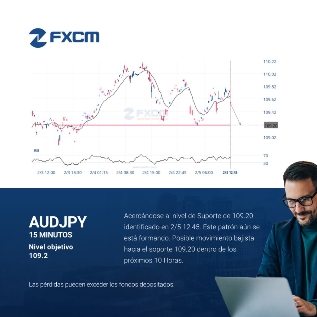 Acercándose al nivel de Suporte de 109.20 identificado en 2/5 12:45. Este patrón aún se está formando. Posible movimiento bajista hacia el soporte 109.20 dentro de los próximos 10 Horas. El rendimiento pasado no es indicativo de resultados futuros. Las pérdidas pueden exceder los depósitos.