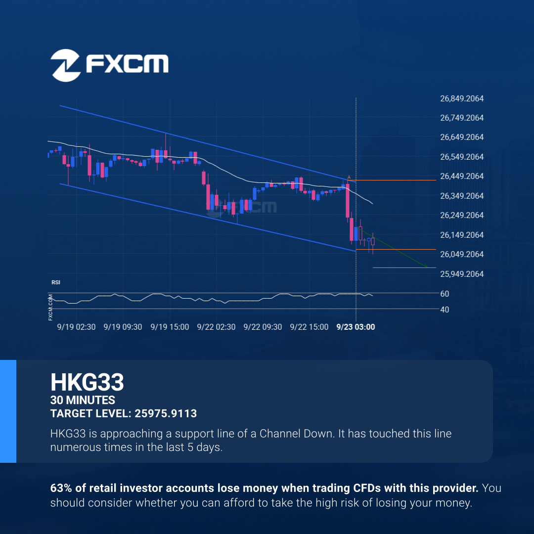 HKG33 is trapped in a Channel Down formation, implying that a breakout is Imminent. This is a great trade-setup for both trend and swing traders. It is now approaching a resistance line that has been tested in the past. Divergence opportunists may be very optimistic about a possible breakout and this may be the start of a new trend. It may also be that this convergence factor may result in the ideal setup for swing traders that are on the lookout for a possible bounce-back. Whatever happens, an initial move towards 25975.9113 is expected in the short term.