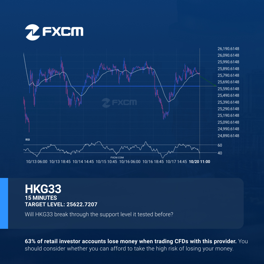 The movement of HKG33 towards 25622.7207 price line is yet another test of the line it reached numerous times in the past. We could expect this test to happen in the next 21 hours, but it is uncertain whether it will result in a breakout through this line, or simply rebound back to current lines.