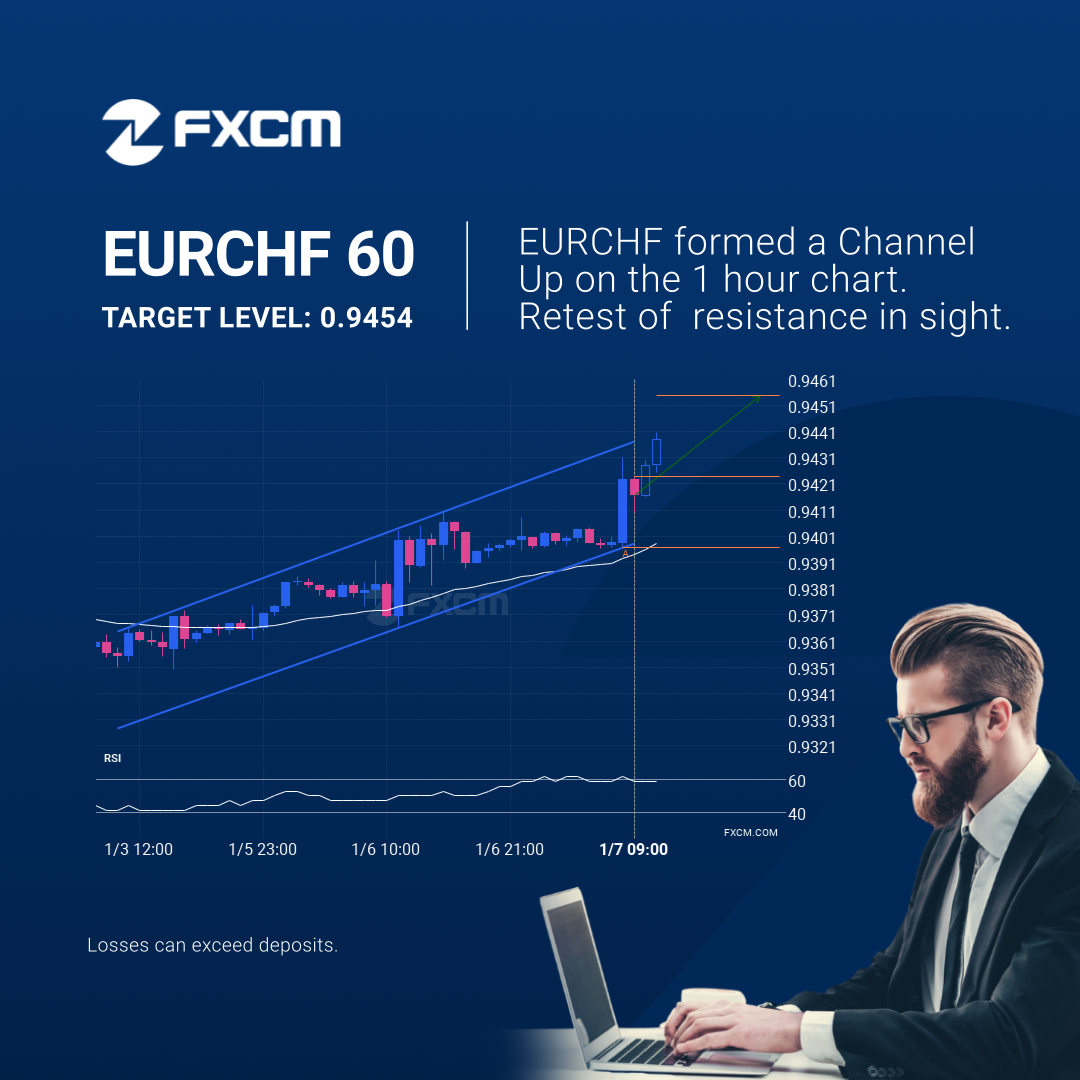 A Channel Up pattern was identified on EURCHF at 0.94235, creating an expectation that it may move to the resistance line at 0.9454. It may break through that line and continue the bullish trend or it may reverse from that line.