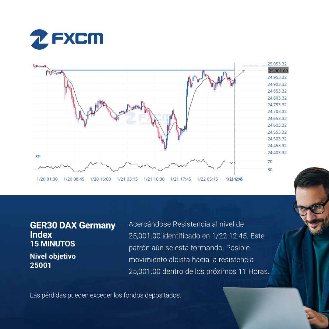 Acercándose Resistencia al nivel de 25,001.00 identificado en 1/22 12:45. Este patrón aún se está formando. Posible movimiento alcista hacia la resistencia 25,001.00 dentro de los próximos 11 Horas.