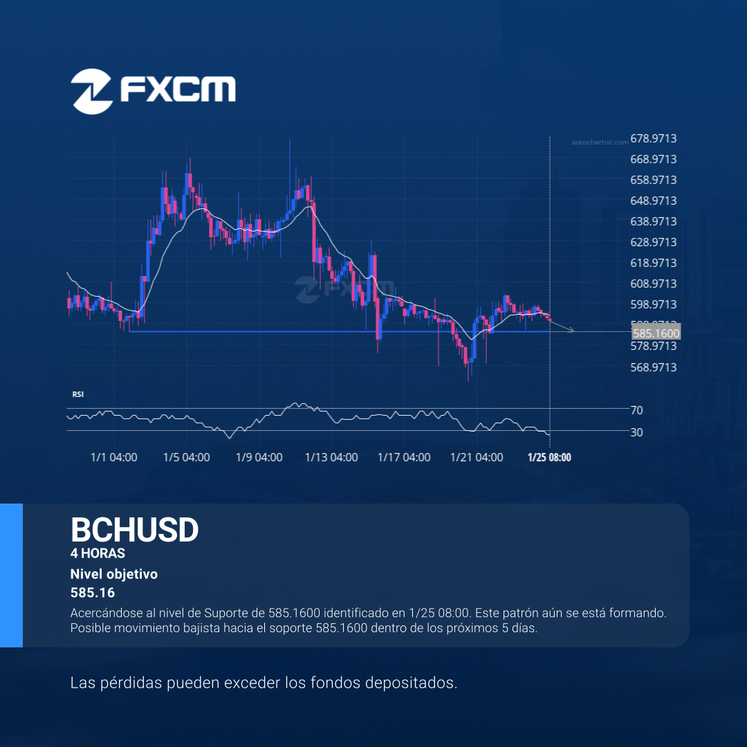 Acercándose al nivel de Suporte de 585.1600 identificado en 1/25 08:00. Este patrón aún se está formando. Posible movimiento bajista hacia el soporte 585.1600 dentro de los próximos 5 días.