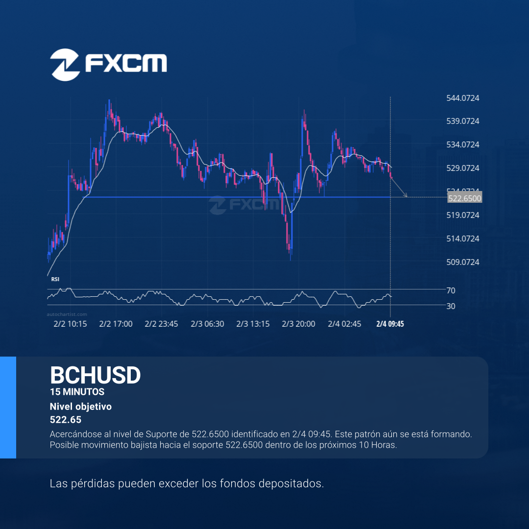 Acercándose al nivel de Suporte de 522.6500 identificado en 2/4 09:45. Este patrón aún se está formando. Posible movimiento bajista hacia el soporte 522.6500 dentro de los próximos 10 Horas.