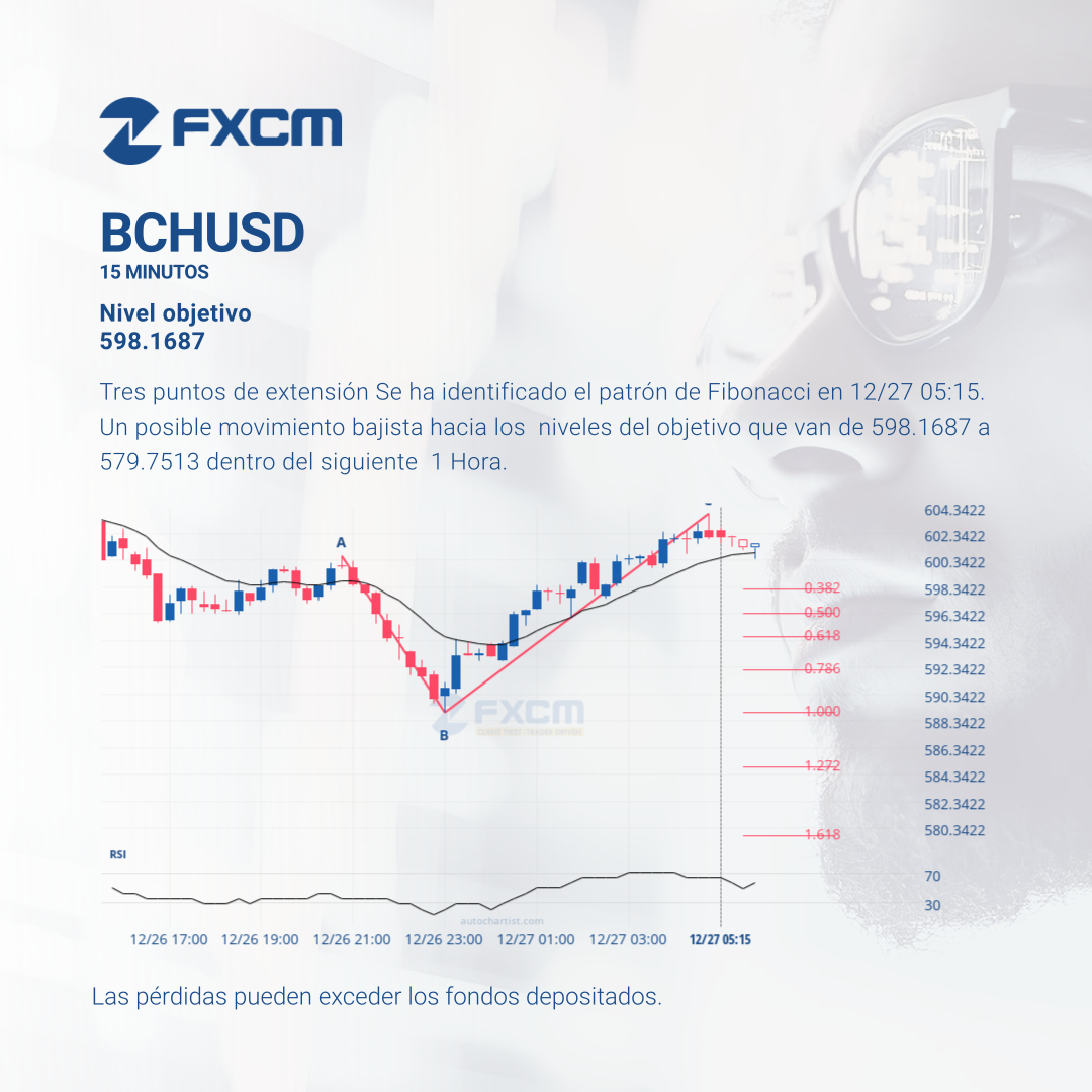 Tres puntos de extensión Se ha identificado el patrón de Fibonacci en 12/27 05:15. Un posible movimiento bajista hacia los niveles del objetivo que van de 598.1687 a 579.7513 dentro del siguiente 1 Hora.