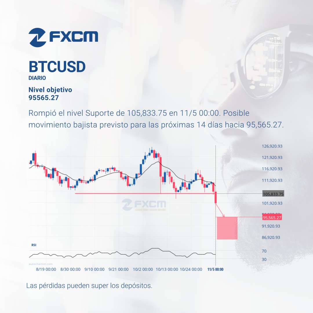Rompió el nivel Suporte de 105,833.75 en 11/5 00:00. Posible movimiento bajista previsto para las próximas 14 días hacia 95,565.27.