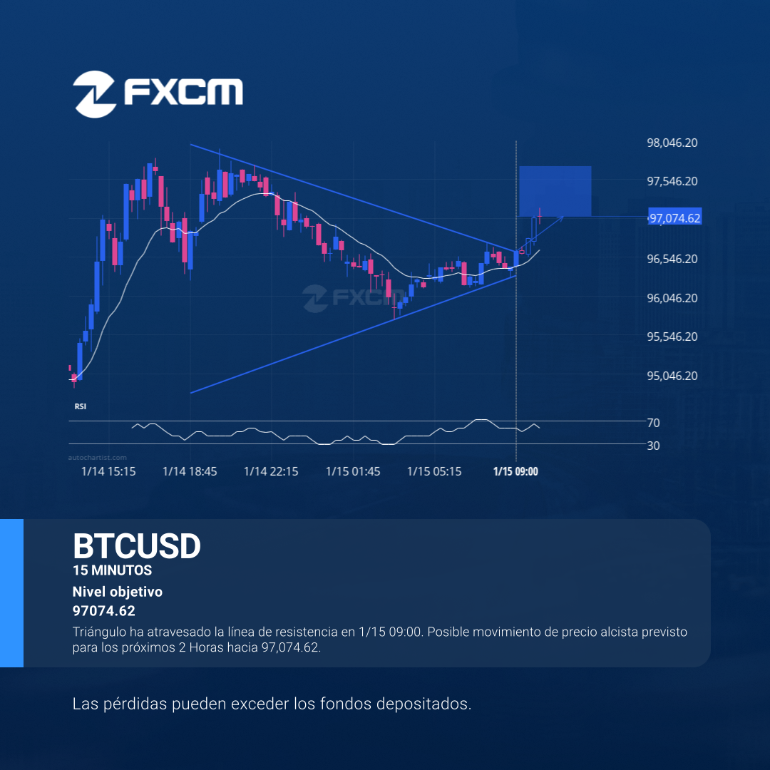 Triángulo ha atravesado la línea de resistencia en 1/15 09:00. Posible movimiento de precio alcista previsto para los próximos 2 Horas hacia 97,074.62.