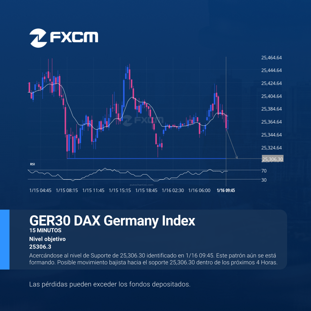Acercándose al nivel de Suporte de 25,306.30 identificado en 1/16 09:45. Este patrón aún se está formando. Posible movimiento bajista hacia el soporte 25,306.30 dentro de los próximos 4 Horas.