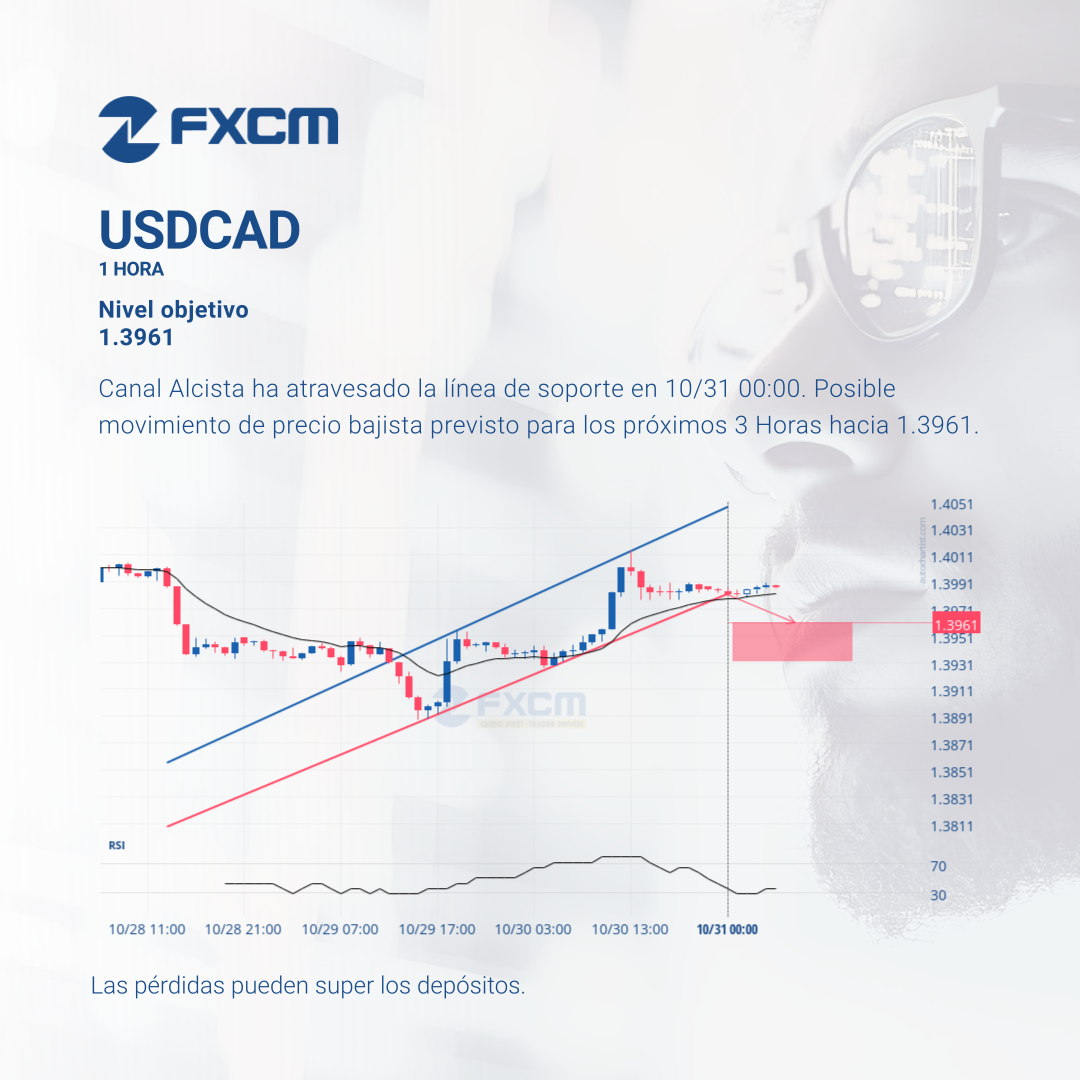 Canal Alcista ha atravesado la línea de soporte en 10/31 00:00. Posible movimiento de precio bajista previsto para los próximos 3 Horas hacia 1.3961.