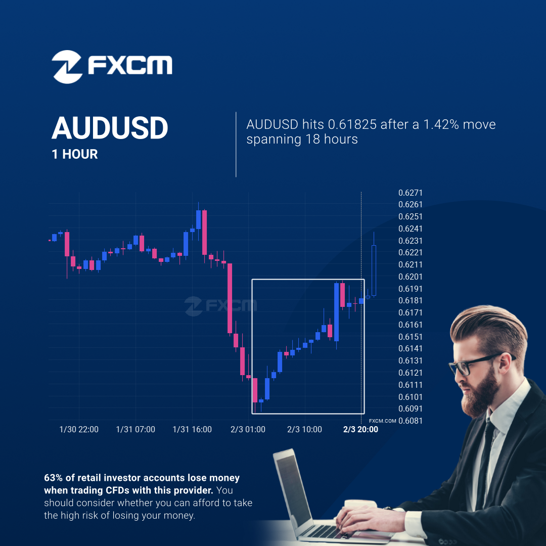 AUDUSD hits 0.61825 after a 1.42% move spanning 18 hours.