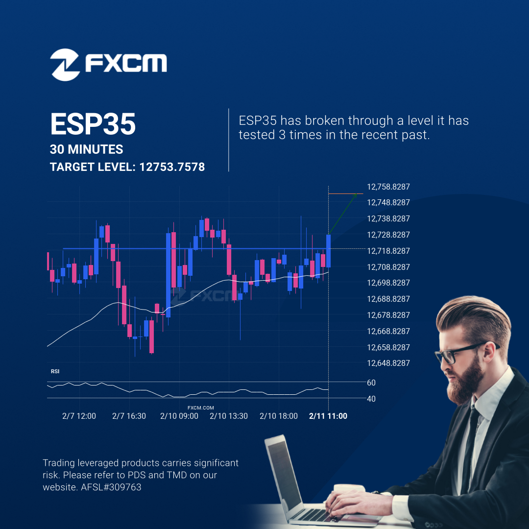 The breakout of ESP35 through the 12719.7197 price line is a breach of an important psychological price that is has tested numerous in the past. If this breakout persists, ESP35 could test 12753.7578 within the next 6 hours. One should always be cautious before placing a trade, wait for confirmation of the breakout.