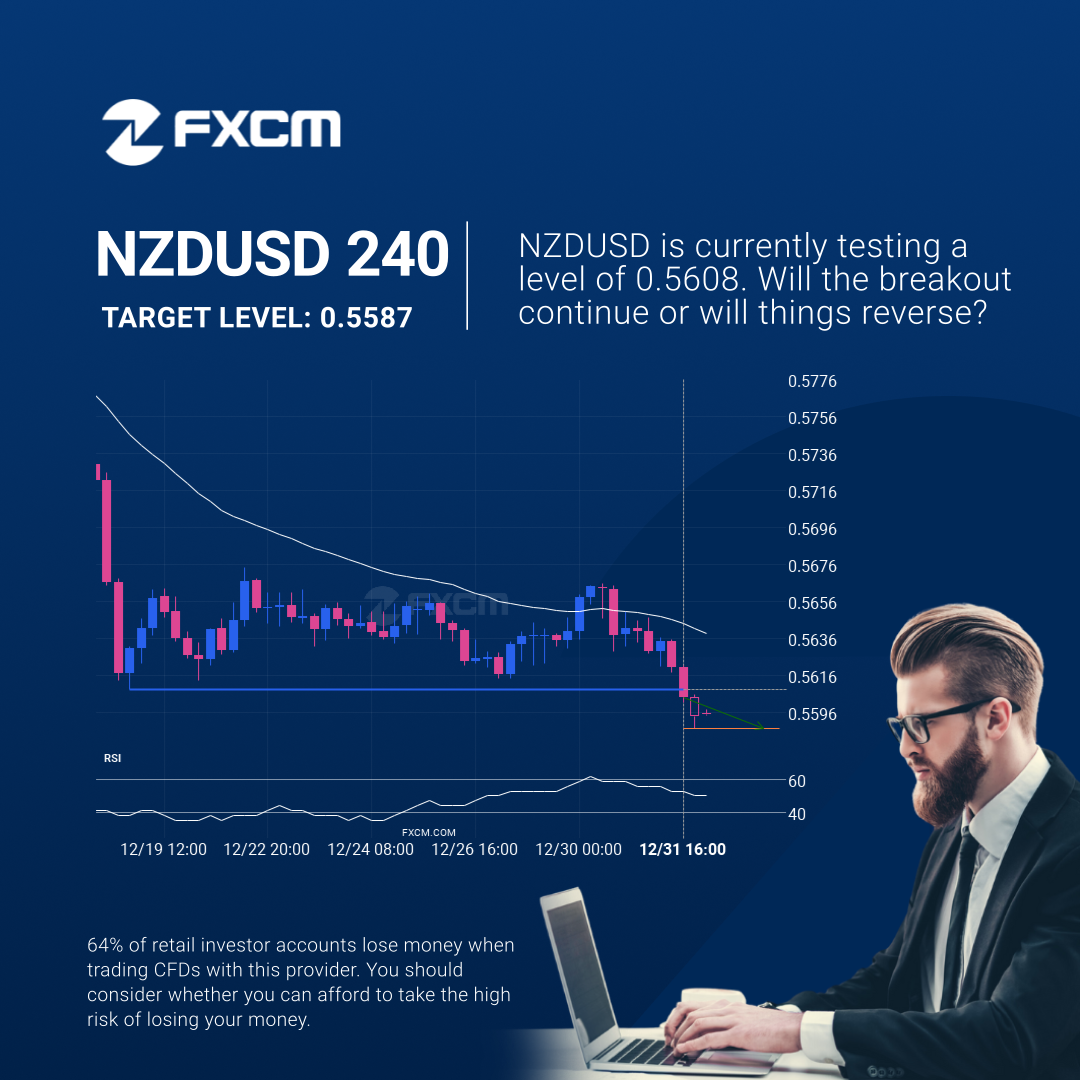 NZDUSD has broken through a support line. Because we have seen it retrace from this price in the past, one should wait for confirmation of the breakout before trading. It has touched this line numerous times in the last 13 days and suggests a possible target level to be around 0.5587 within the next 2 days.