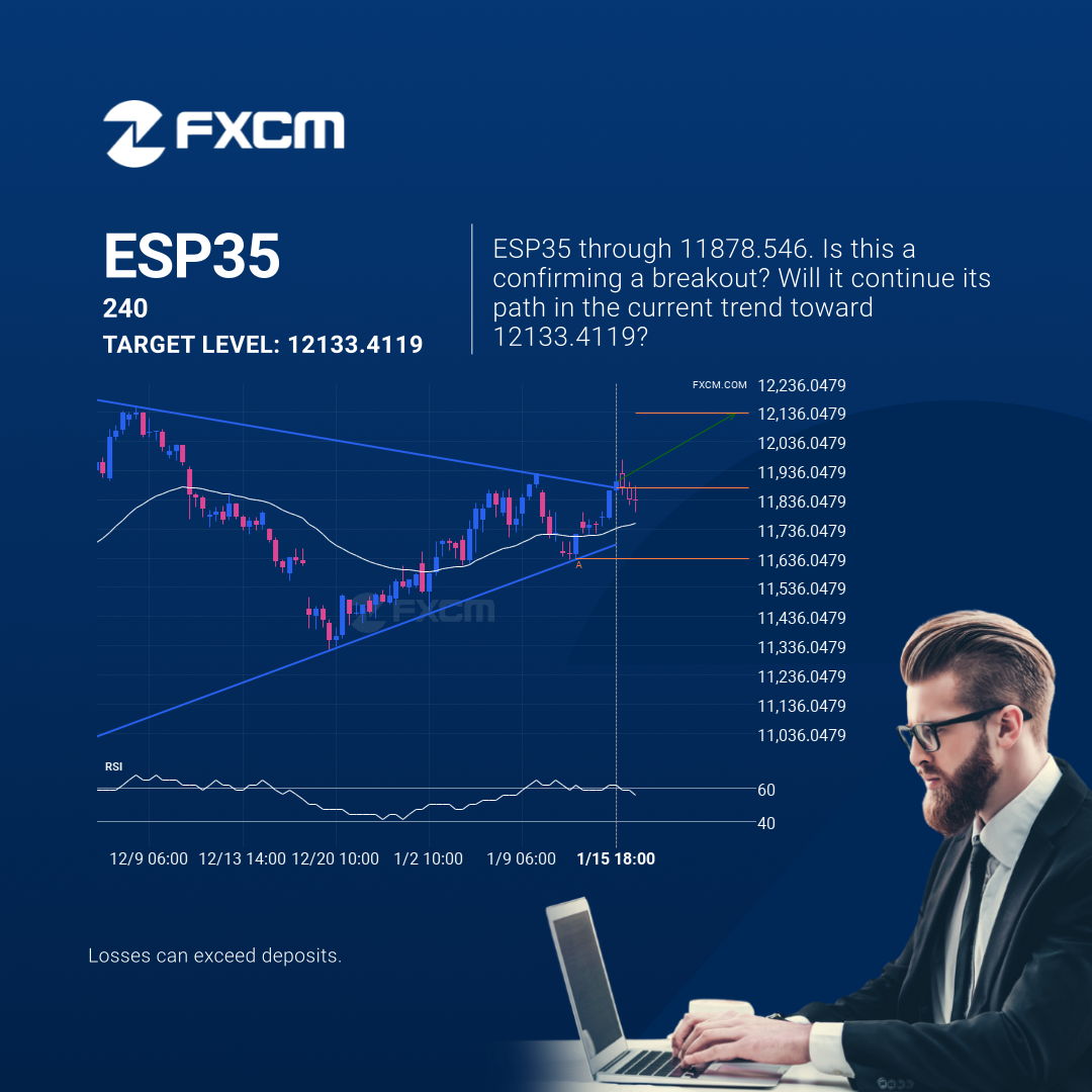 ESP35 has broken through a resistance line. It has touched this line at least twice in the last 50 days. This breakout may indicate a potential move to 12133.4119 within the next 3 days. Because we have seen it retrace from this position in the past, one should wait for confirmation of the breakout before trading.