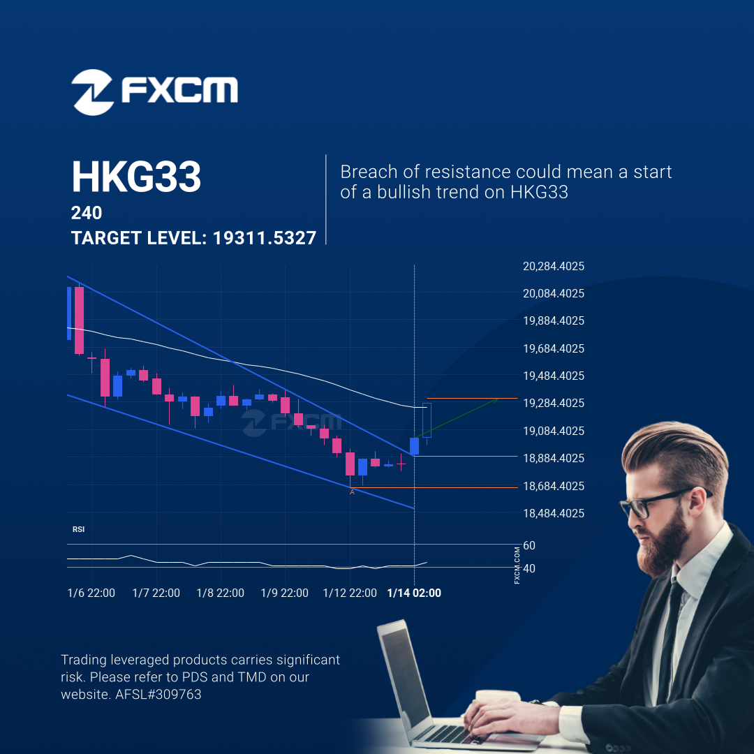 HKG33 has broken through a resistance line. It has touched this line at least twice in the last 12 days. This breakout may indicate a potential move to 19311.5327 within the next 2 days. Because we have seen it retrace from this position in the past, one should wait for confirmation of the breakout before trading.