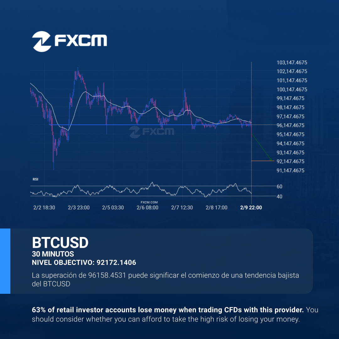 BTCUSD ha roto la línea de soporte en 96158.4531. Puede continuar la tendencia bajista hacia 92172.1406 o puede resultar ser otro testeo más de este nivel.