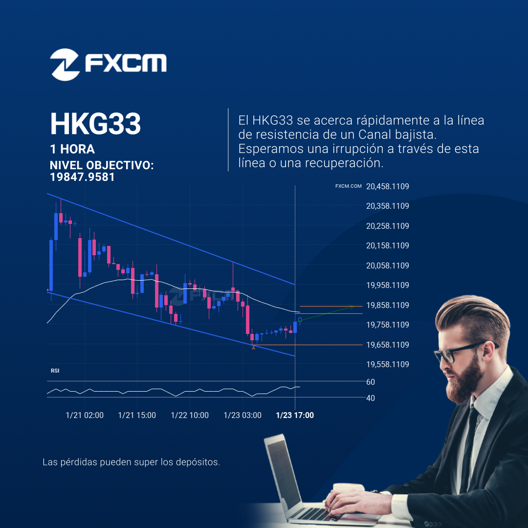 El HKG33 avanza hacia una línea de resistencia. Como le hemos visto retroceder desde esta línea anteriormente, podríamos presenciar, o bien, una ruptura a través de esta línea o una recuperación a los niveles actuales. Ha llegado a esta línea en numerosas ocasiones en los últimos 7 días y puede probarla de nuevo en las próximas 14 horas.