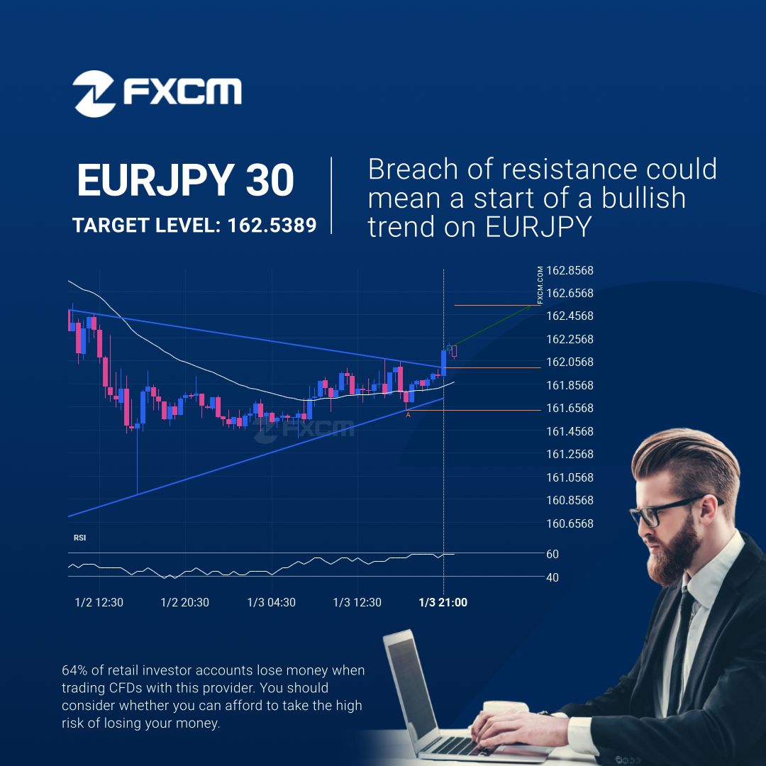 EURJPY has broken through a resistance line of a Triangle chart pattern. If this breakout holds true, we may see the price of EURJPY testing 162.5389 within the next 9 hours. But don’t be so quick to trade, it has tested this line in the past, so you should confirm the breakout before taking any action.