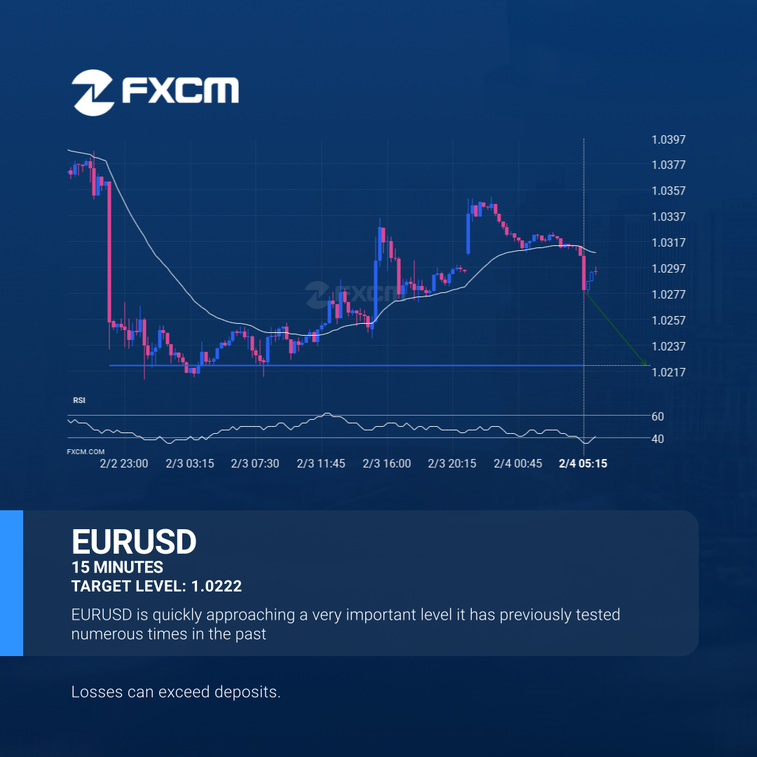 EURUSD is approaching a support line at 1.0222. If it hits the support line, it may break through this level to continue the bearish trend, or it may turn around back to current levels.