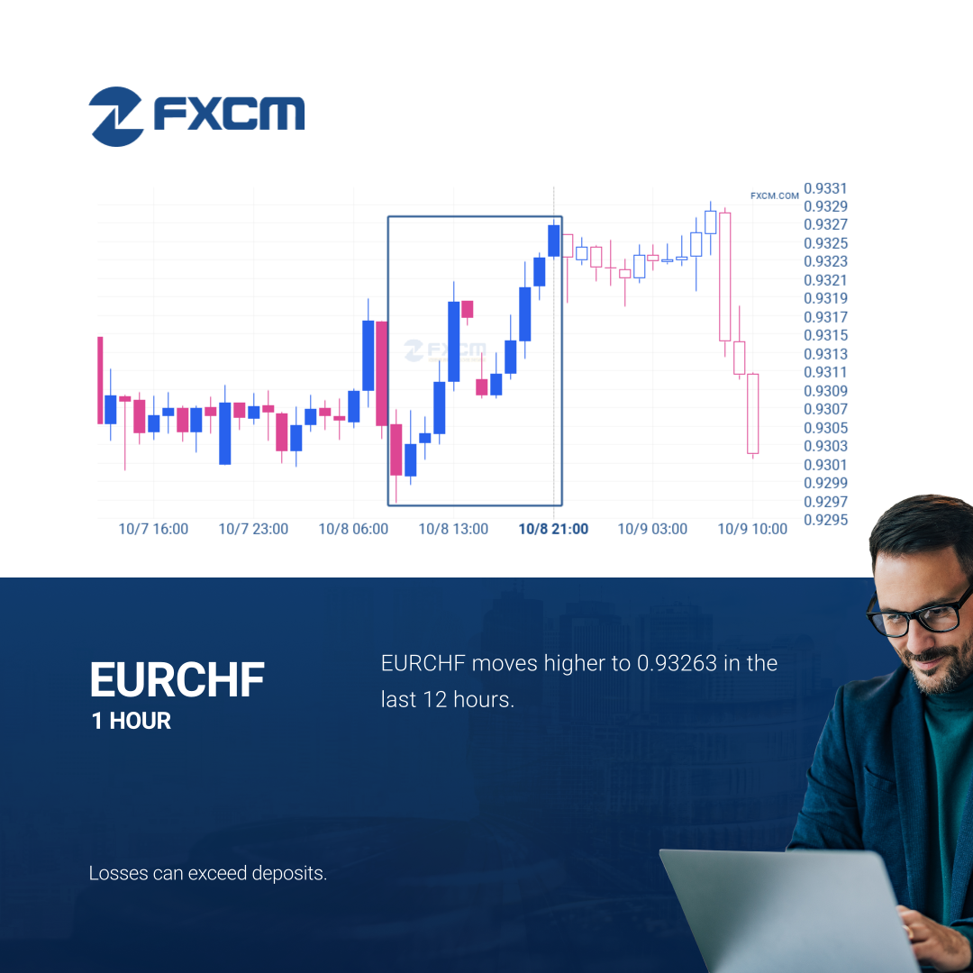 EURCHF has moved higher by 0.29% from 0.92992 to 0.93263 in the last 12 hours.