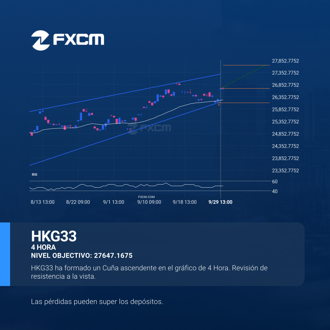 El patrón de Cuña ascendente emergente en su ola final se identificó en el gráfico de 4 Hora de HKG33. Después de un fuerte movimiento alcista, encontramos que HKG33 se dirige hacia la línea del triángulo superior con una posible resistencia en 27647.1675. Si resulta que el nivel de resistencia aguanta, el patrón de Cuña ascendente sugiere un rebote hacia los niveles actuales.