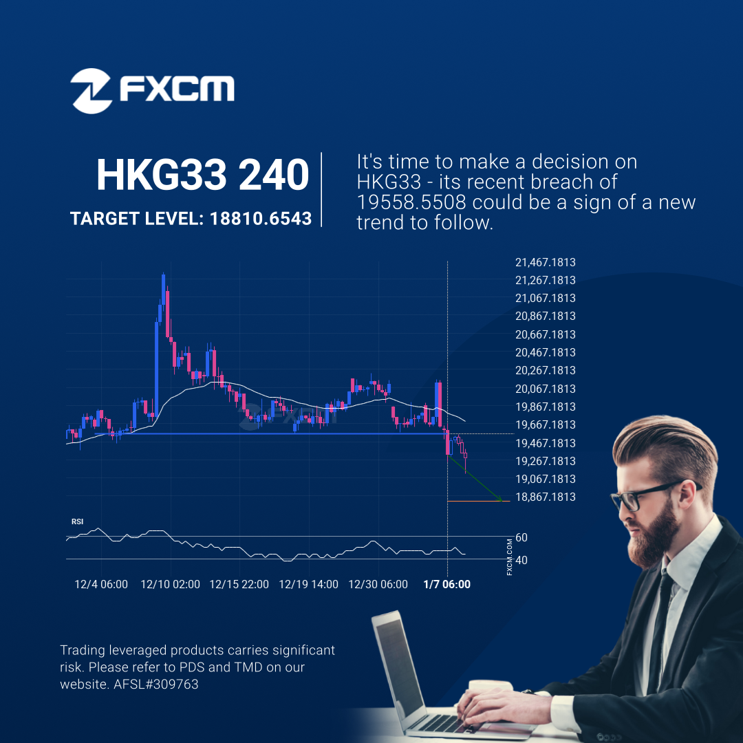 HKG33 has breached the support line at 19558.5508. It may continue the bearish trend towards 18810.6543, or, it may prove to be yet another test of this level.