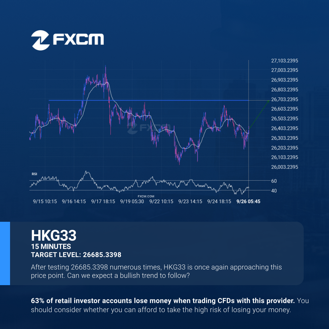 HKG33 is moving towards a resistance line. Because we have seen it retrace from this level in the past, we could see either a break through this line, or a rebound back to current levels. It has touched this line numerous times in the last 11 days and may test it again within the next 2 days.