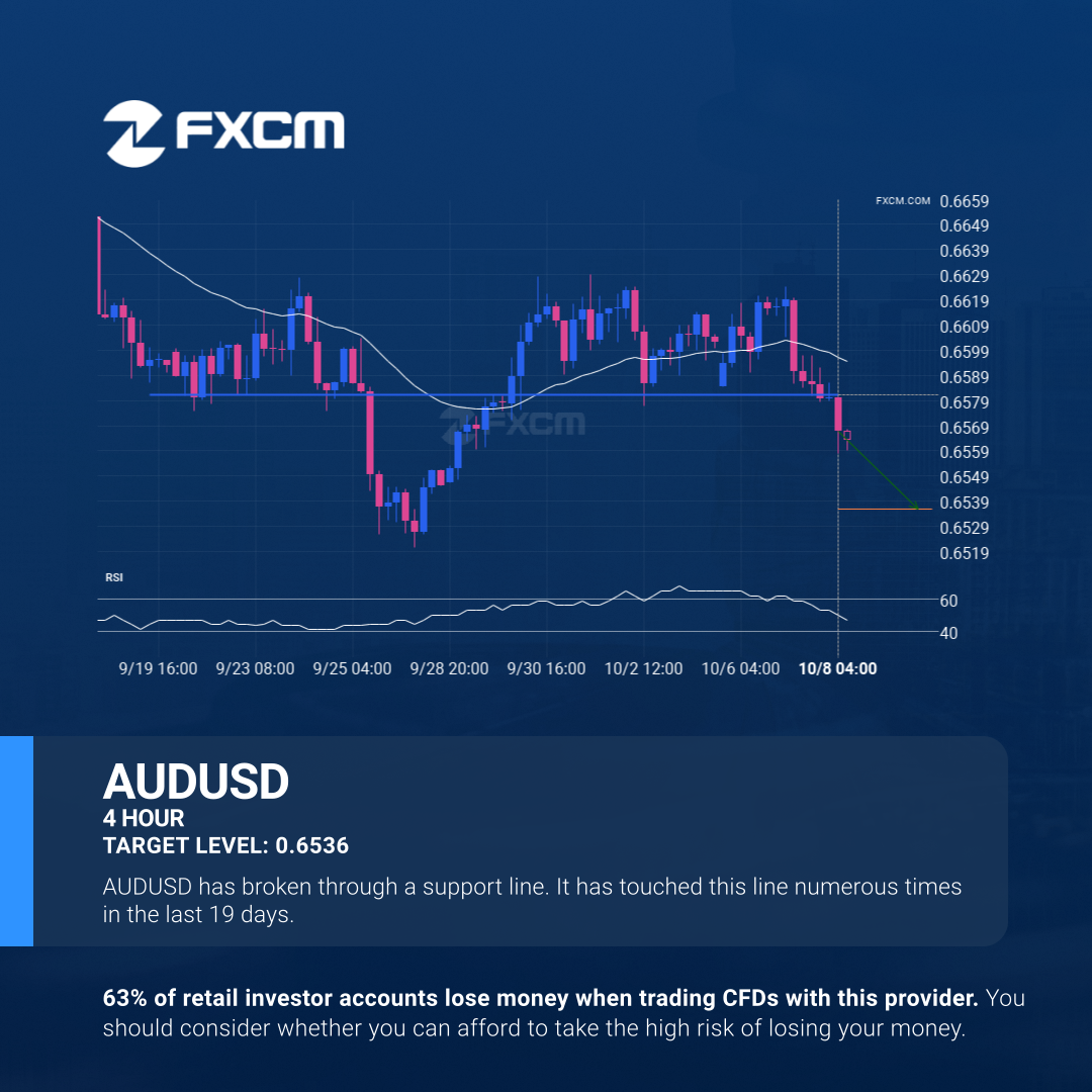 AUDUSD has broken through a support line. It has touched this line numerous times in the last 19 days. This breakout shows a potential move to 0.6536 within the next 4 days. Because we have seen it retrace from this level in the past, one should wait for confirmation of the breakout.