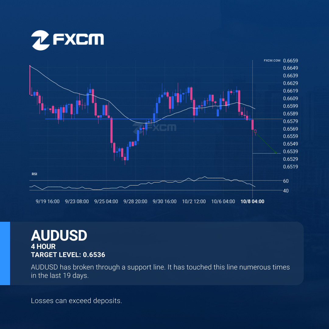 AUDUSD has broken through a support line. It has touched this line numerous times in the last 19 days. This breakout shows a potential move to 0.6536 within the next 4 days. Because we have seen it retrace from this level in the past, one should wait for confirmation of the breakout.