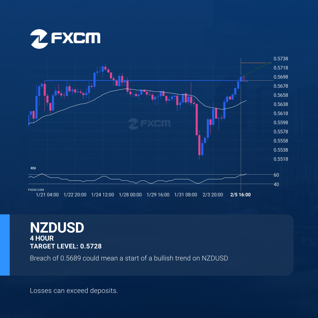 A strong resistance level has been breached at 0.5689 on the 4 hour NZDUSD chart. Technical Analysis theory forecasts a movement to 0.5728 in the next 3 days.