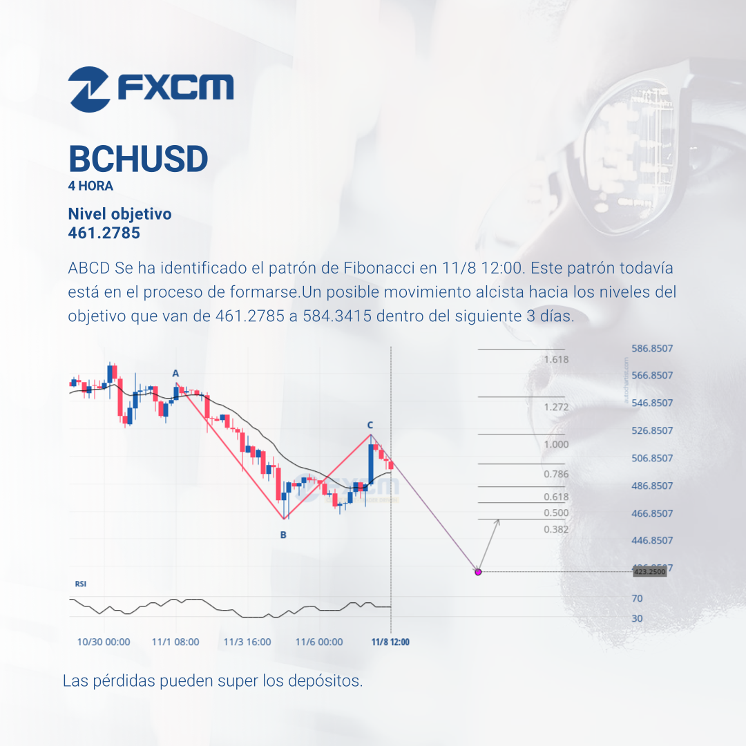 ABCD Se ha identificado el patrón de Fibonacci en 11/8 12:00. Este patrón todavía está en el proceso de formarse.Un posible movimiento alcista hacia los niveles del objetivo que van de 461.2785 a 584.3415 dentro del siguiente 3 días.