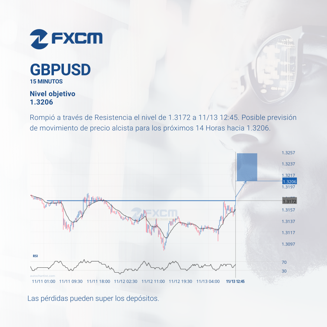 Rompió a través de Resistencia el nivel de 1.3172 a 11/13 12:45. Posible previsión de movimiento de precio alcista para los próximos 14 Horas hacia 1.3206.
