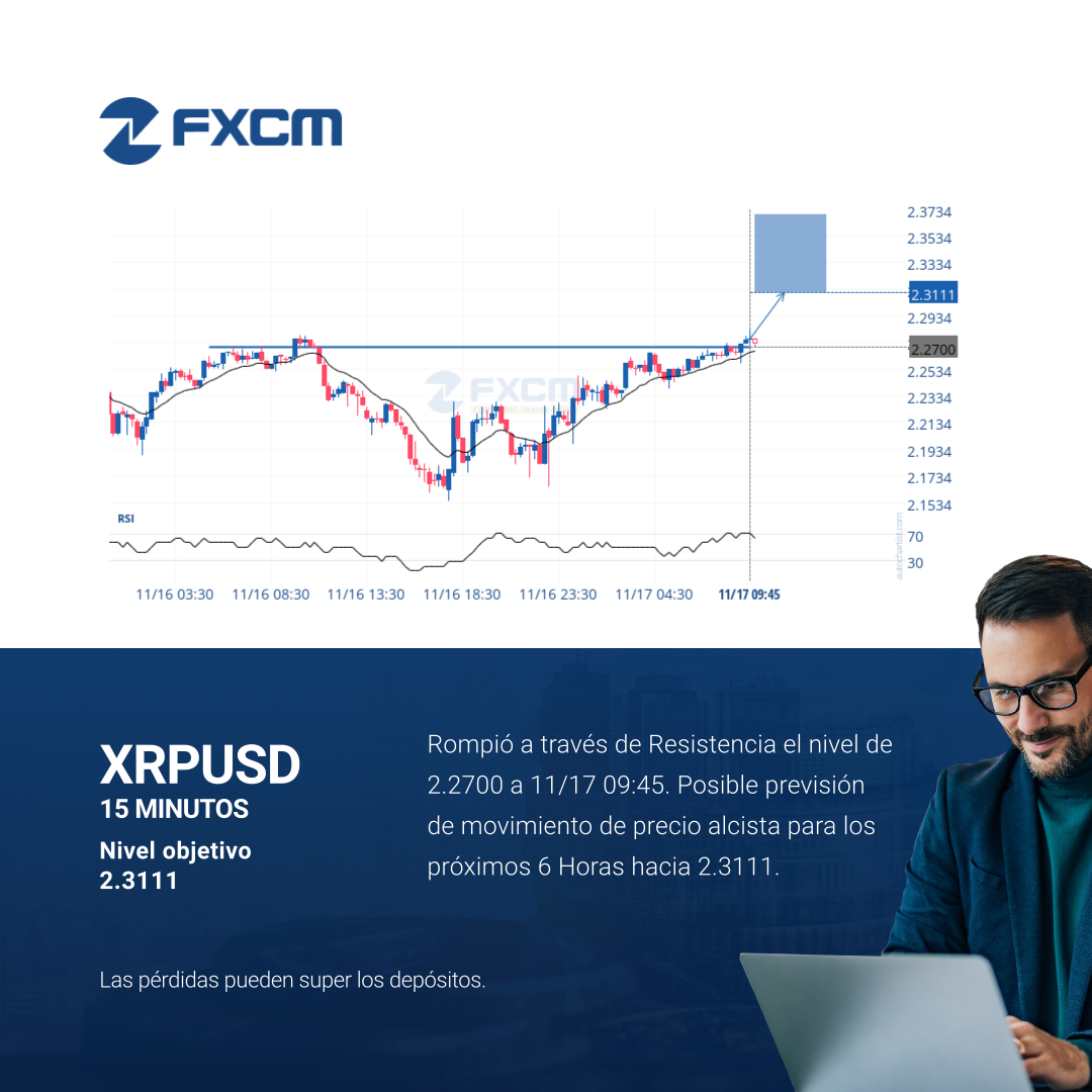 Rompió a través de Resistencia el nivel de 2.2700 a 11/17 09:45. Posible previsión de movimiento de precio alcista para los próximos 6 Horas hacia 2.3111.