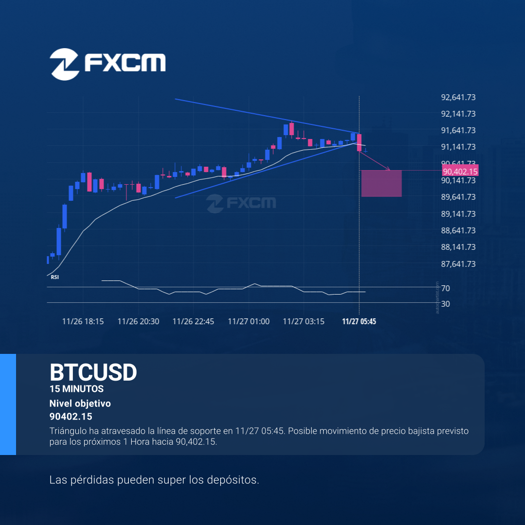 Triángulo ha atravesado la línea de soporte en 11/27 05:45. Posible movimiento de precio bajista previsto para los próximos 1 Hora hacia 90,402.15.